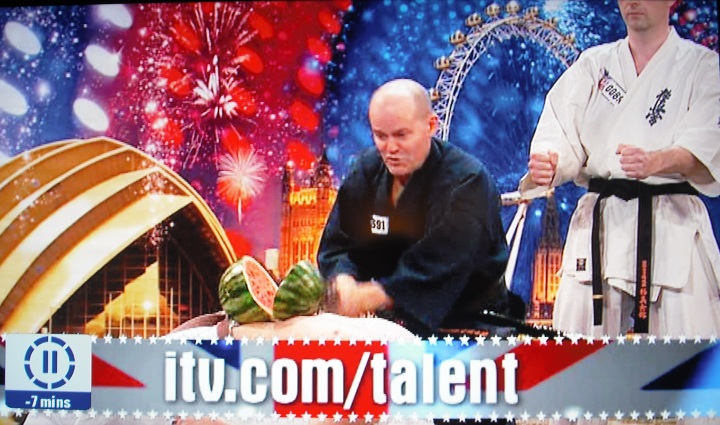 In the closing credits for Britain's Got Talent on 17th April a clip of Shihan Martin cutting a melon with his katana on the stomach of Eamon was showing to publicise acts from future shows.